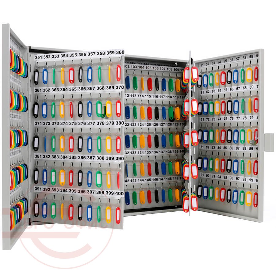 Ключевой замок, количество крючков для ключей — 600 шт. В комплект ключниц входят пластиковые цветные брелоки, рассчитанные на количество ключей и самоклеящиеся номерки.