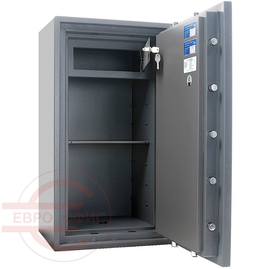 Огнестойкость: ГОСТ Р 57384-2017: класс 60Б (ГОСТ Р). При заливке двери и корпуса сейфа используется запатентованная система армирования огнестойкого бетона. 3-х сторонняя усиленная ригельная система запирания. Защита замка и ригелей от высверливания и выбивания. Система блокировки ригельного механизма при выбивании замка. Тепловой замок, усиленный огнестойким уплотнителем. Толщина защитного слоя двери – 33мм, общая толщина двери - 105мм. Толщина боковых стенок - 77мм; толщина задней стенки – 51мм. Комплектуются электронным кодовым замком PS 610/E36. Наличие анкерного крепления к полу, анкерный болт в комплекте