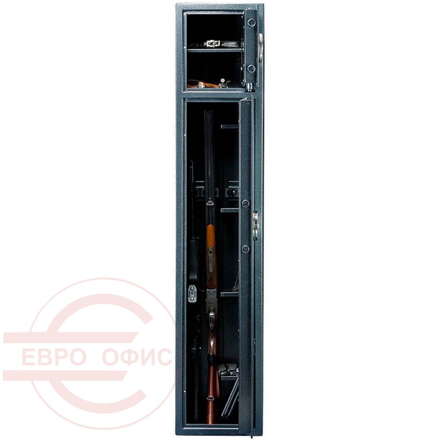 Надёжный сейф для оружия. Предназначен для хранения огнестрельного оружия и патронов к нему. Сейфы соответствуют требованиям ст.59 Постановления правительства РФ № 814 от 21 июля 1998 года «О мерах по регулированию гражданского и служебного оружия и патронов к нему на территории РФ». Соответствуют Классу А.1 оружейных сейфов в соответствии с требованиями ГОСТ Р 56367-2015. В основе 3-х сторонняя ригельная система запирания (диаметр ригеля 18 мм). Сейф оборудован патронным отделением (трейзер), запирающимся на ключ (соответствующий 3 классу по ГОСТ Р 5089-2003 или замок не ниже класса А по ГОСТ 51053-2012), полками и ложементами для ружей, ковриком. Конструкция комплектуется двумя кодовыми электронными замками PS 310/E31 (Промет), а также анкерными отверстиями для крепления сейфа к полу и стене.