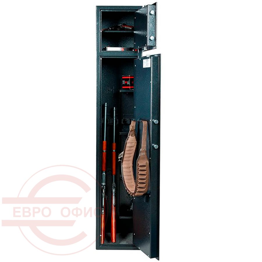 Надёжный сейф для оружия. Предназначен для хранения огнестрельного оружия и патронов к нему. Сейфы соответствуют требованиям ст.59 Постановления правительства РФ № 814 от 21 июля 1998 года «О мерах по регулированию гражданского и служебного оружия и патронов к нему на территории РФ». Соответствуют Классу А.1 оружейных сейфов в соответствии с требованиями ГОСТ Р 56367-2015.толщина металла корпуса – 3 мм; толщина металла двери – 5 мм. В основе 3-х сторонняя ригельная система запирания (диаметр ригеля 18 мм). Сейф оборудован патронным отделением (трейзер), запирающимся на ключ (соответствующий 3 классу по ГОСТ Р 5089-2003 или замок не ниже класса А по ГОСТ 51053-2012), полками и ложементами для ружей, ковриком. Конструкция комплектуется двумя кодовыми электронными замками PS 310/E31 (Промет), а также анкерные отверстия для крепления сейфа к полу и стене.