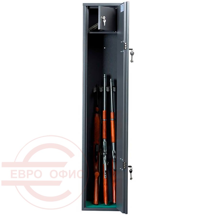 Надёжный сейф для хранения оружия. Предназначен для хранения огнестрельного оружия. Сейфы соответствуют требованиям ст.59 Постановления правительства РФ №814 от 21 июля 1998 года «О мерах по регулированию гражданского и служебного оружия и патронов к нему на территории РФ». Сейф оборудован патронным отделением, запирающимся на ключ и ложементами для ружей