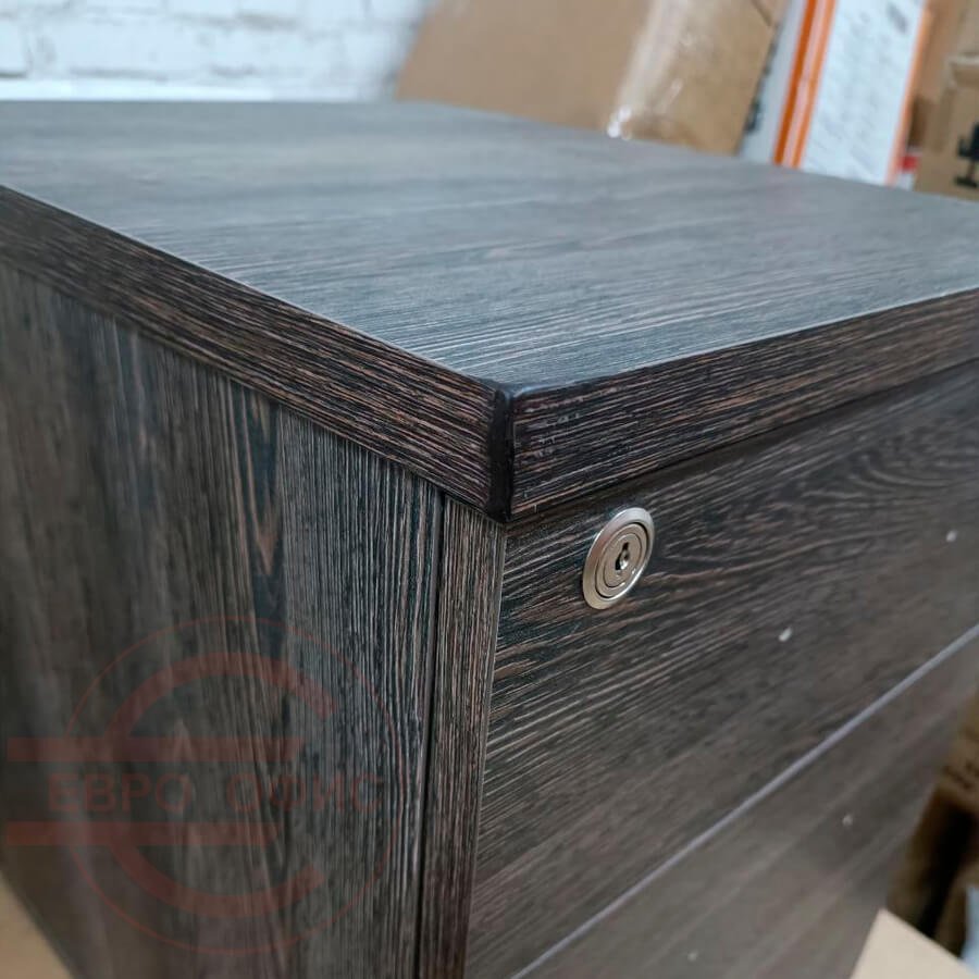 2 складывающихся ключа. Центральный замок на верхнем ящике. Металлические ручки выдвижных ящиков. Толщина каркаса и фасада —18 мм, толщина топа —25 мм,