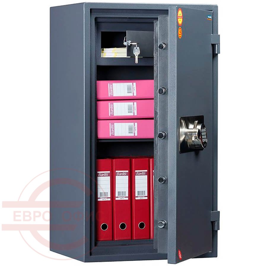 Огнестойкость: ГОСТ Р 57384-2017: класс 60Б (ГОСТ Р). При заливке двери и корпуса сейфа используется запатентованная система армирования огнестойкого бетона. 3-х сторонняя усиленная ригельная система запирания. Защита замка и ригелей от высверливания и выбивания. Система блокировки ригельного механизма при выбивании замка. Тепловой замок, усиленный огнестойким уплотнителем. Толщина защитного слоя двери – 33мм, общая толщина двери - 105мм. Толщина боковых стенок - 77мм; толщина задней стенки – 51мм. Комплектуются электронным кодовым замком PS 610/E36. Наличие анкерного крепления к полу, анкерный болт в комплекте