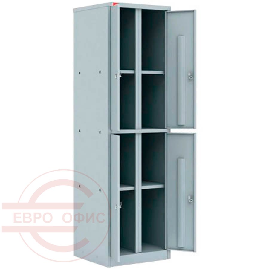 Четыре секции, закрываемые замком. Шкаф разборный, собирается с помощью саморезов.